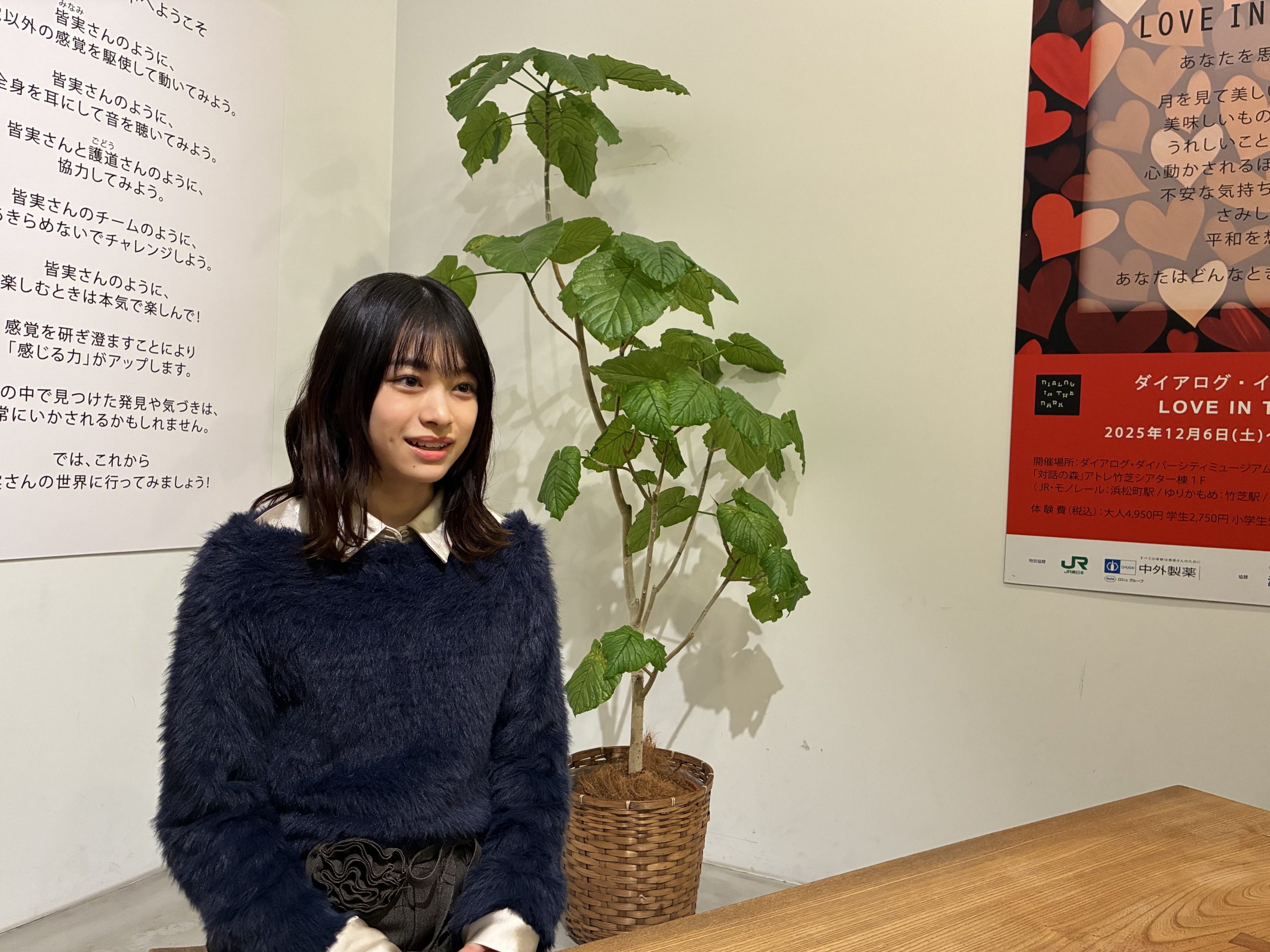 暗闇ならではの体験を聞かれると、「日頃は手を使わずとも見えるのでそこに何があるのか分かりますが、暗闇の中ではまず手の甲で触れてみたりなどして確かめていました。また、新たな発見もあり、プログラム内のカフェコーナーでリンゴジュースを飲んだのですが、暗闇の中の方が美味しく感じたのは驚きでした」とエピソードを披露。他にも、「「 ありがとう」や「ここにいます」という言葉の一つひとつを掛け合うことが大切だと気づきました。暗闇の中にいるときは日常よりも温もりを感じ、仲間がいることの安心感や、一人ひとりの心の温かさ、仲間を思う気持ちというものが自分にも伝わってきました。私も暗闇の中で相手に合図を出したりするなど、自分からも温もりを伝えたいと思いました」と、振り返りました。