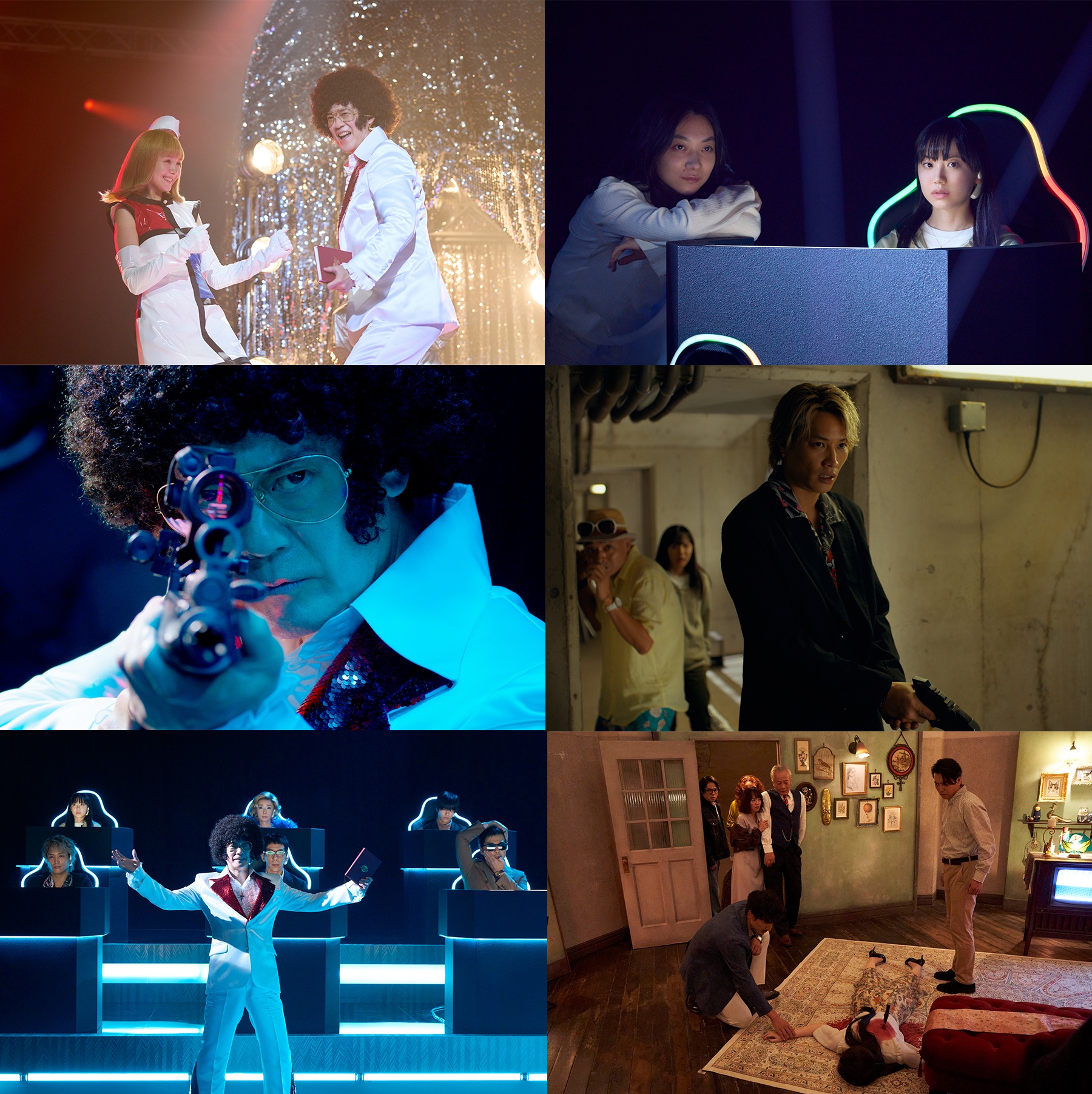 華やかな番組セットにて満面の笑顔で進行を務める司会者・樺山(唐沢寿明)がアシスタントのモンテレオーネ怜華(トリンドル玲奈)と踊る姿だけでなく、解答者の一子(芦田愛菜)をにらみつける姿や銃を構える姿も捉えられ、樺山が二面性のある怪しさ満点のキャラクターであることがうかがえる。また、他の人には見えない一子の親友・サンゴ(三浦透子)が、一子の傍で何かをたくらむように微笑んでいる姿や、ギャンブル(鈴木伸之)が銃を構える後ろで怯えているような大穴(宇野祥平)と一子の姿、そして、「ミステリー・アリーナ」で出題される問題「嵐の中、孤立した洋館で起きた殺人事件」の殺人シーンなど、不穏なシーンの数々を捉えた場面写真が到着。ハイテンションな司会者と対照的に険しい表情をした解答者たち、さらにはテレビ推理ショーには似つかわしくない銃を構えた姿は、「犯人当てたら100億円!」と謳われる裏で不穏なことが起きている様子を予感させ、狂気がにじみ出る写真となっている。