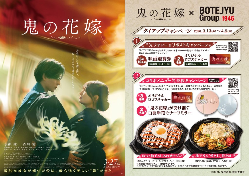 店舗で注文したコラボメニューを #鬼の花嫁 #ぼてぢゅうフォト 付けてポストして頂いた方から抽選でプレゼント致します。