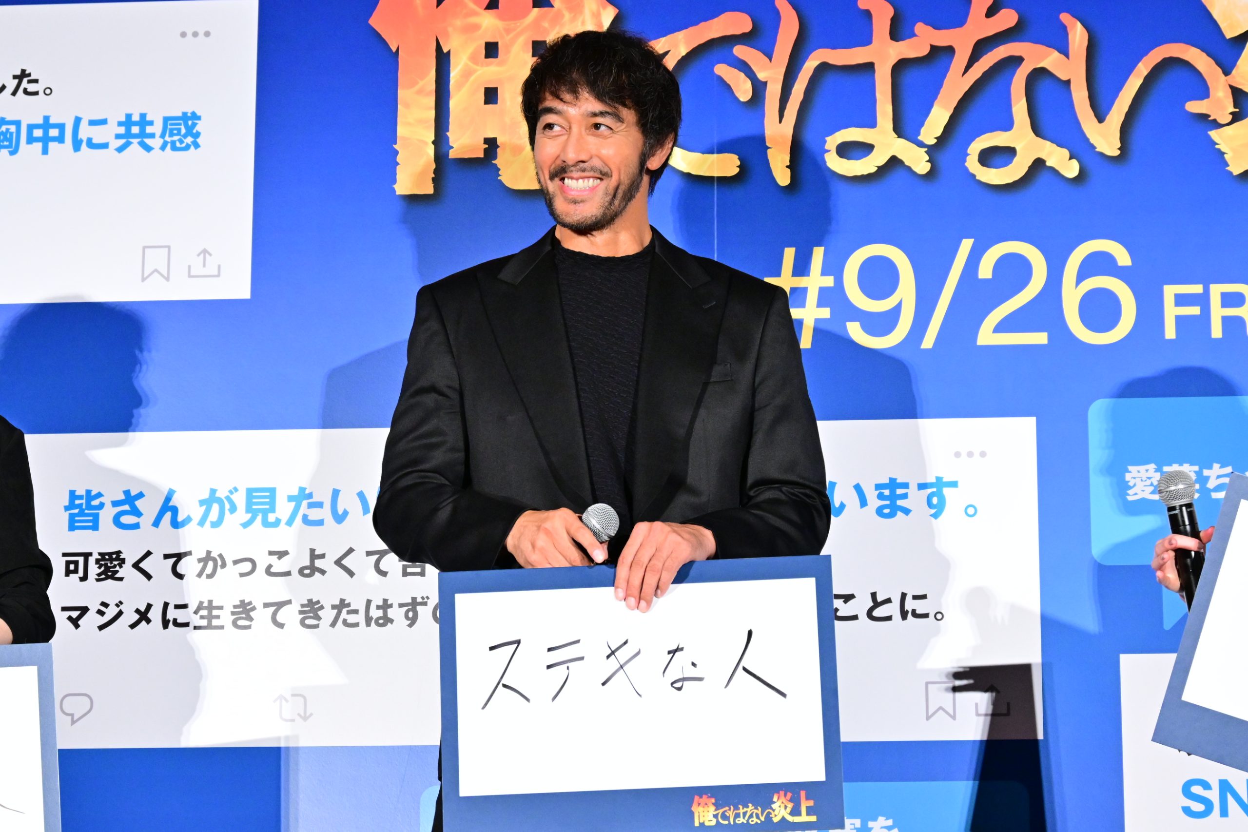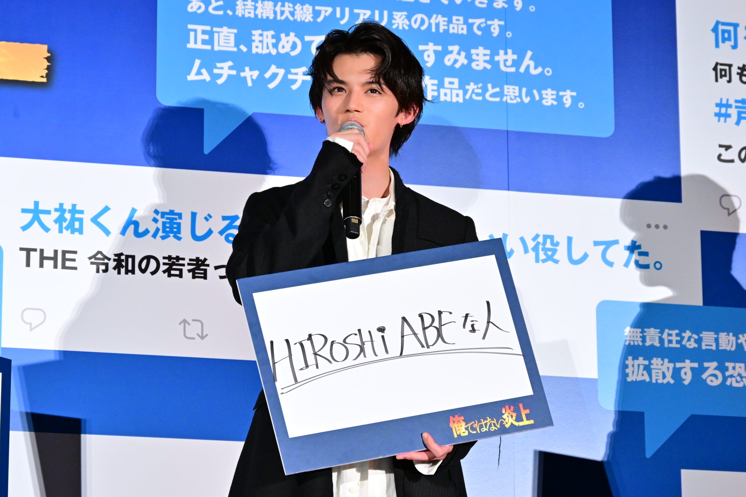ステージ両脇に大炎上をイメージしたスモークが激しく焚かれる中、ある日突然 SNS 上で炎上&殺人事件の犯人に仕立て上げられた男・山縣泰介を演じた阿部は「最近僕はカッコいい役が続いていて久々のみじめな男でしたが、どうでしたか?」と満席の会場から拍手喝采を浴びつつ「撮影は1年ほど前に行われ、監督に相談しながら、色々な人に助けられながら完成させました」と念願の初日を前に挨拶した。