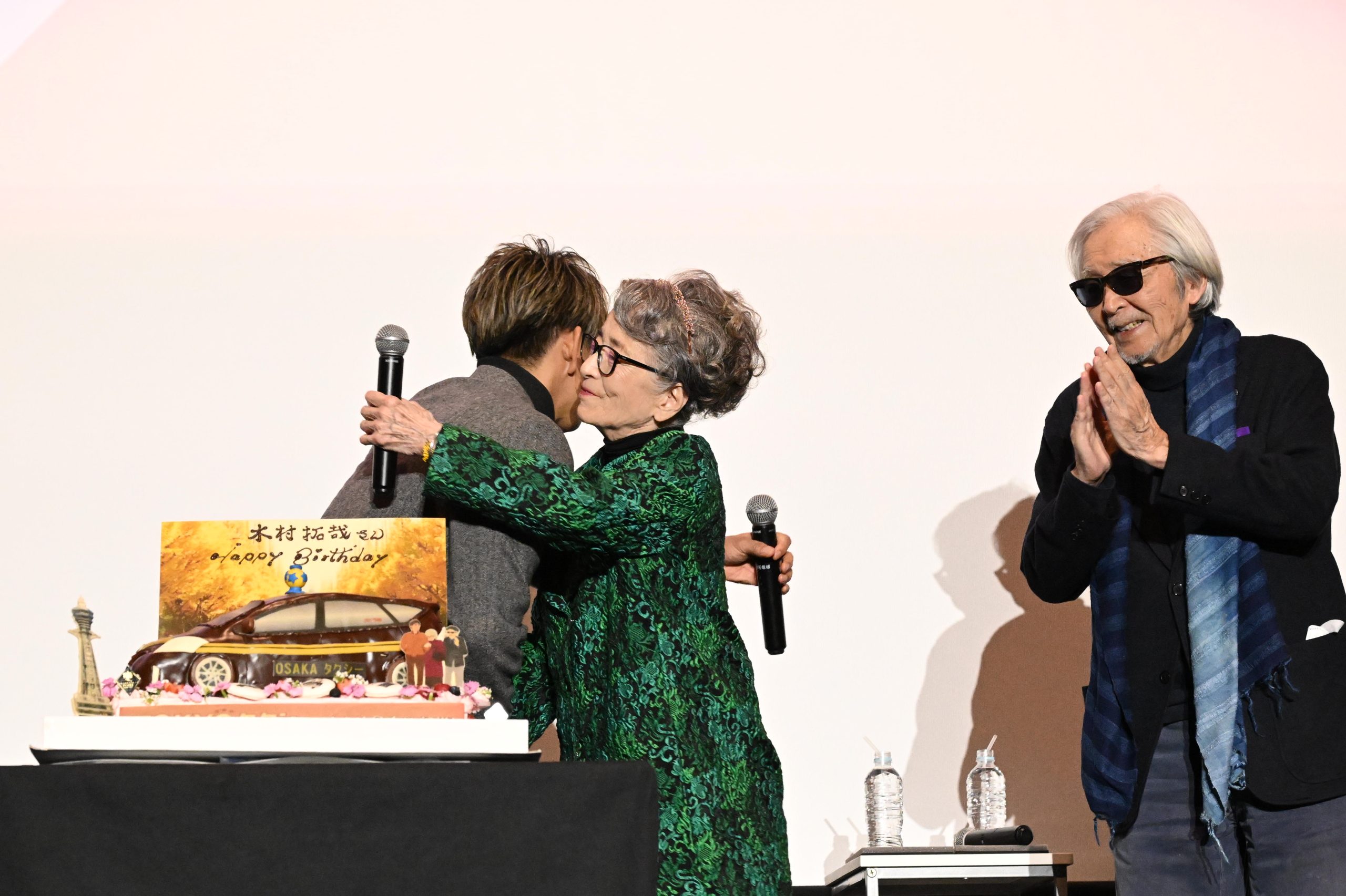 そして舞台挨拶が終盤に差し掛かった頃、翌日11月13日に誕生日を迎える木村へサプライズでお祝い!登場した特大のバースデーケーキは、劇中で木村演じる宇佐美浩二が運転するタクシーを完全再現したデザインとなっており、倍賞は「このタクシーに私たち乗ってたのね」と山田監督も交え3人でケーキを囲むと、木村も「スイートな感じですね(笑)」と照れながら笑顔でコメント。さらに倍賞からのサプライズでバースデーソング生歌唱というサプライズプレゼントも。歌う前に倍賞が突如“HAPPY BIRTH DAY”と書かれたカチューシャを頭に着けると、それを見た木村が嬉しそうに大爆笑。倍賞のチャーミングさに会場も「かわいいー!」と歓声が湧いた。そして、倍賞の美声が会場に響き渡る中、観客と最後のフレーズを歌い上げ、木村の誕生日を一足早く祝福。サプライズ歌唱とケーキのプレゼントに感極まった木村は倍賞と熱いハグを交わした。その場にいる全員が幸せに満ちた表情で、観客からも大きなあたたかい拍手が贈られた。